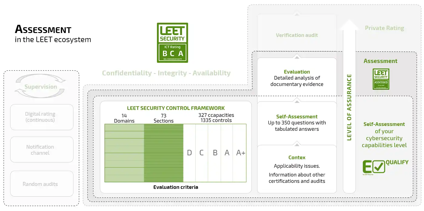 Our Assessment service has as its starting point the complete control framework of LEET Security, in its 14 domains and with the 5 levels that characterize our rating, and like this, it begins with the completion of the self-assessment using the tool E-Qualify, in which all the questions corresponding to the level selected as objective must be completed, identifying the evidence and / or indicating the way in which compliance with the controls that have been marked is carried out.
