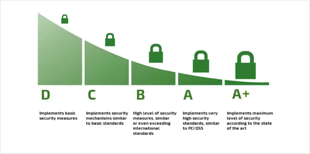 All the practices included in the rating guide are classified into 5 levels, from A+ to D; the 'D' level already demands meeting basic safety measures and corresponding to level 'A+' for best possible package os measures at the current time. Thus, the “A+” level' is reserved for those services that manage highly confidential information (such as industrial or national secrets) or very stringent availability requirements (such as critical infrastructures).